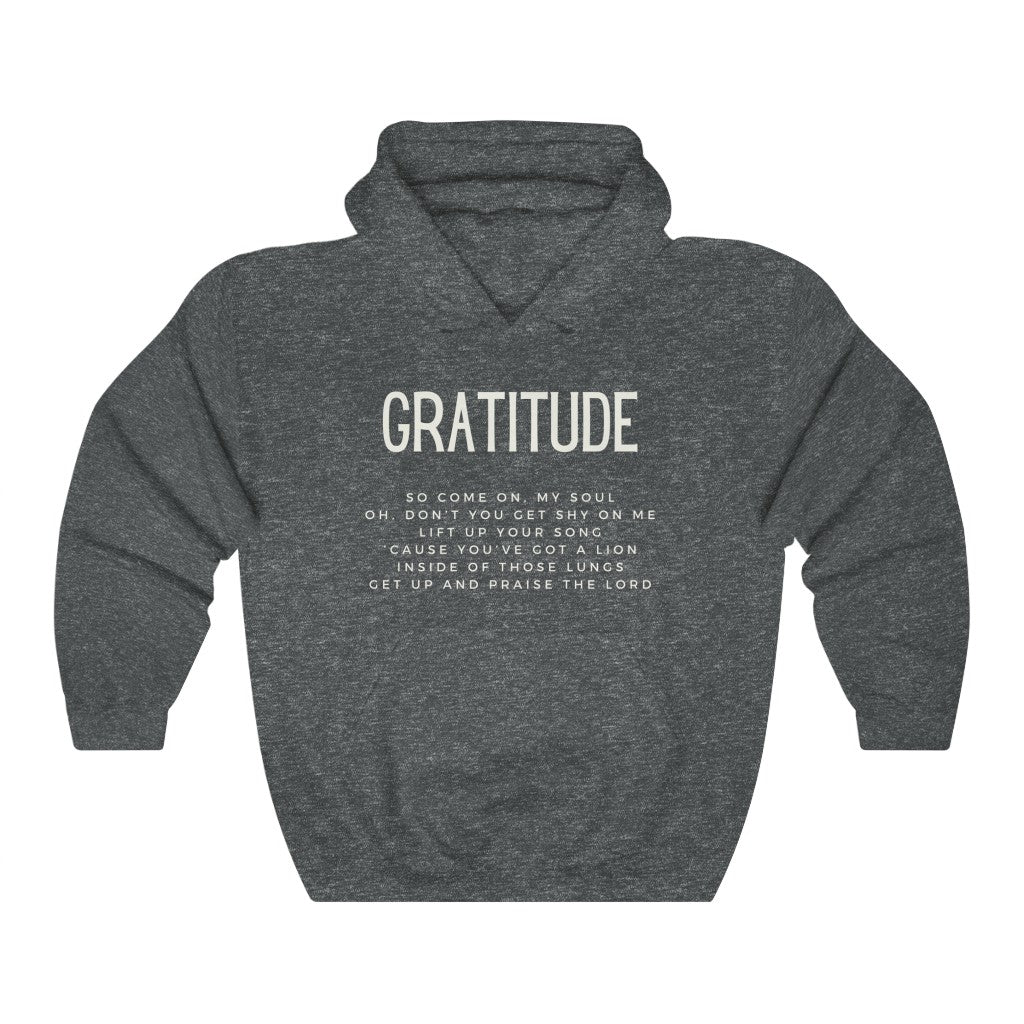 Gratitude hoodie is the perfect hoodie to show how thankful you are that you have a Heavenly Father that loves and cares for you! This hoodie has the bridge to the Maverick City Song Gratitude on the front and the Chorus of the song on the back! Colors available are black with ivory letters, sandstone with ivory letters, military green with ivory letters, and dark heather with ivory letters!