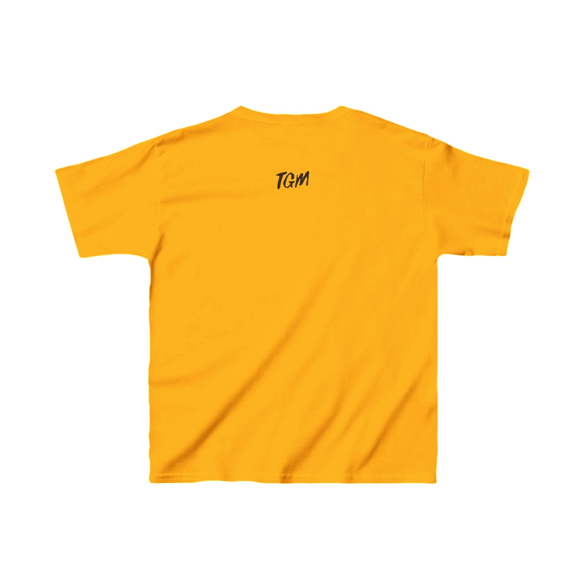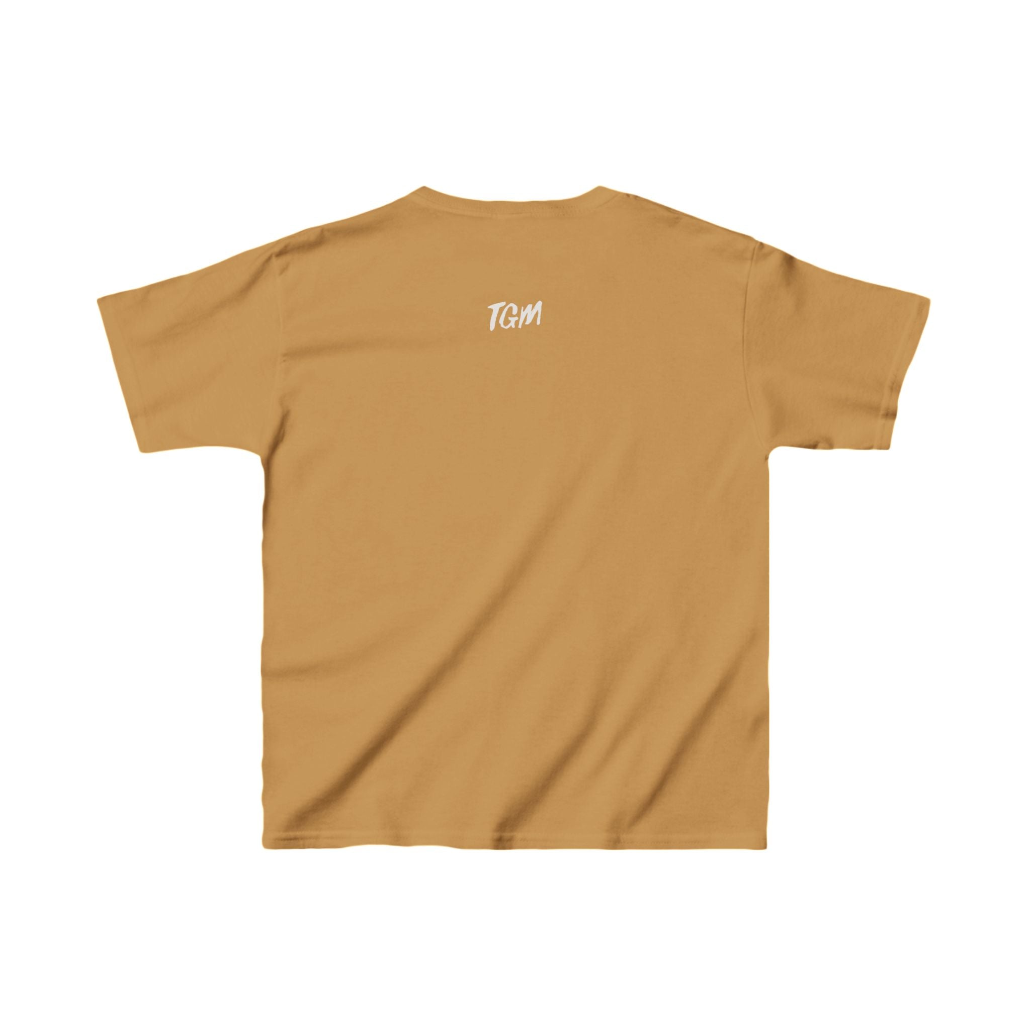 The kids heavy cotton tee is perfect for everyday use. The fabric is 100% cotton for solid colors. Polyester is included for heather-color variants. The shoulders have twill tape for improved durability. The collar is curl resistant due to ribbed knitting. There are no seams along the sides.